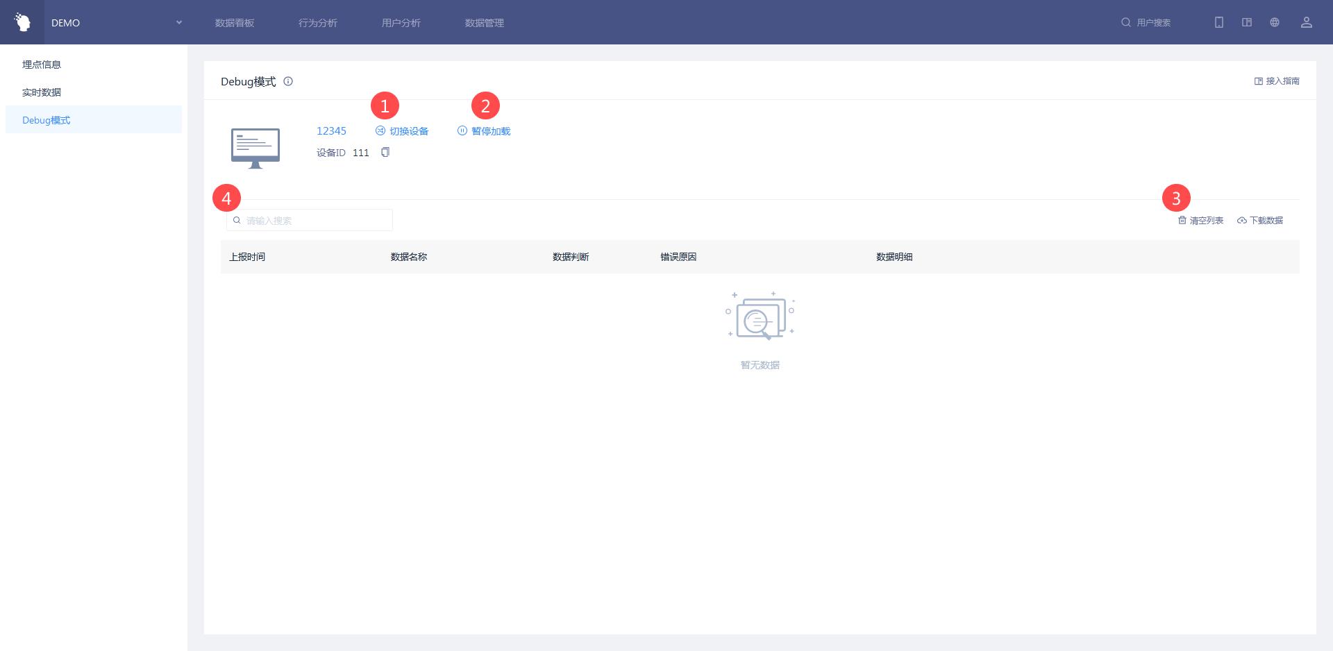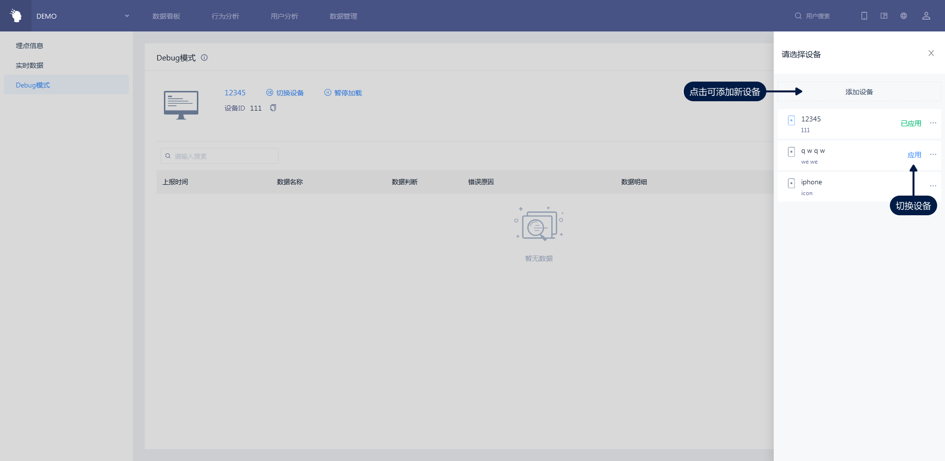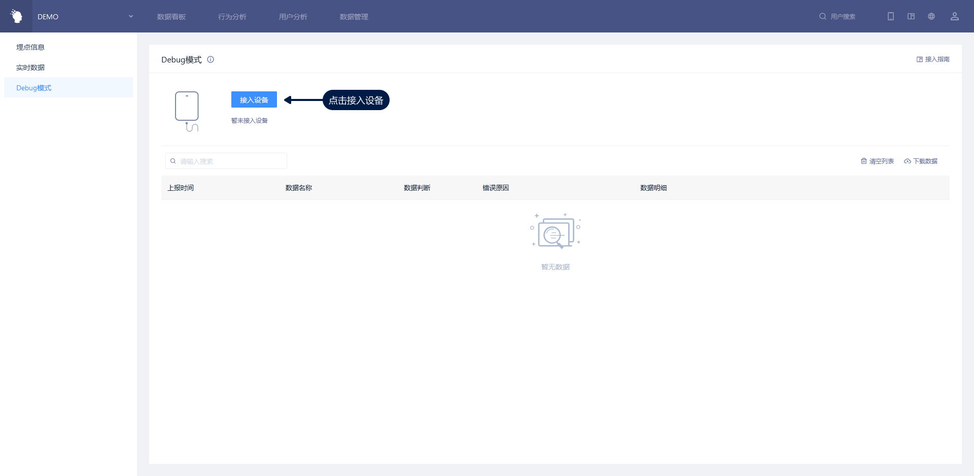 为了避免 Debug 模式在生产环境上线,需指定设备才能开启 Debug 模式。只有在客户端开启了 Debug 模式,并在埋点管理- Debug 数据 中进行接入配置的设备才能开启 Debug 模式。