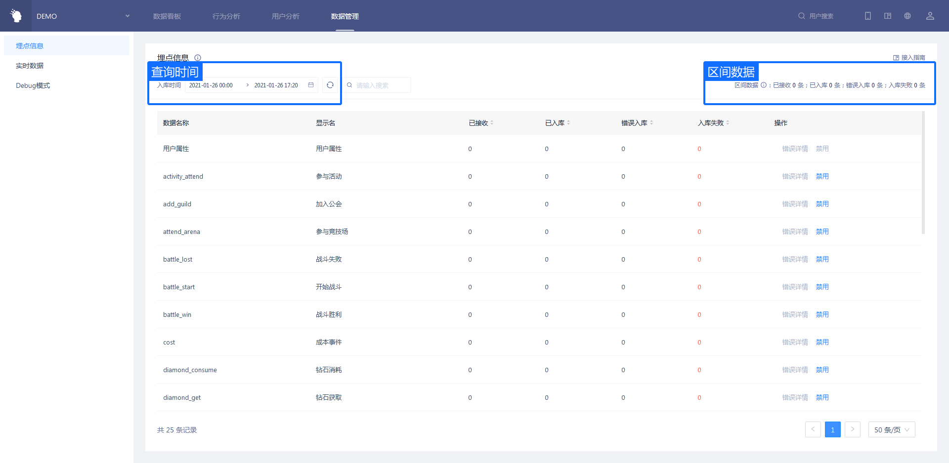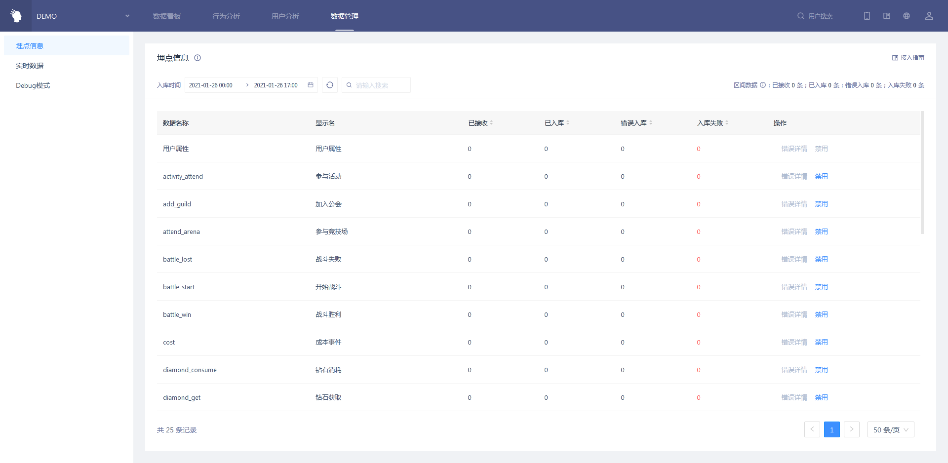 埋点信息:查看最近 7 日项目内数据接收情况,对埋点事件进行禁用/启用管理。