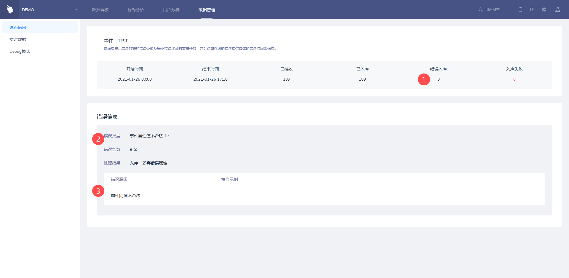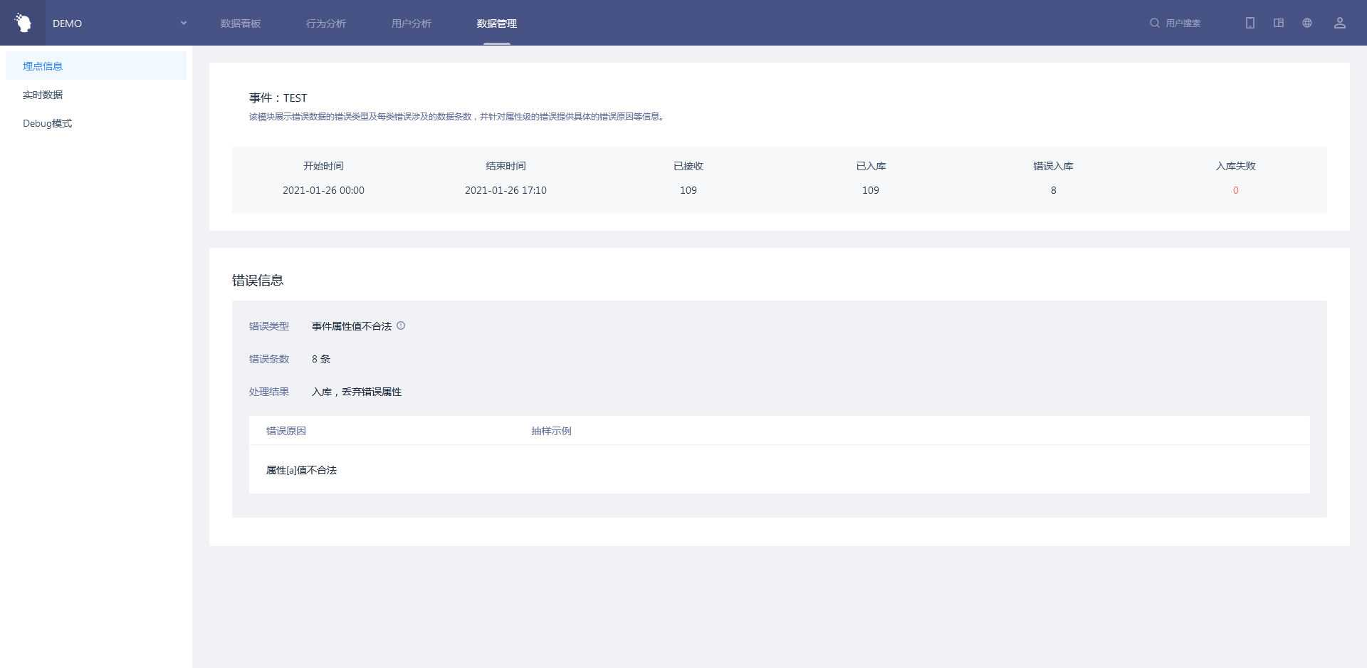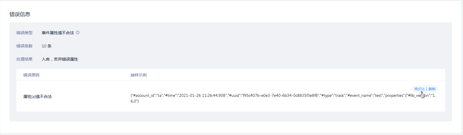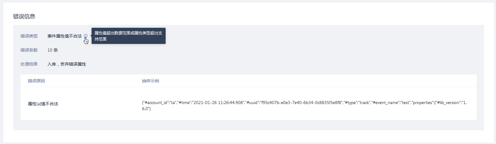 - 错误入库的 2 条数据中,2 条均存在“事件属性名不合法”错误、1 条存在“事件属性类型不合法”错误;