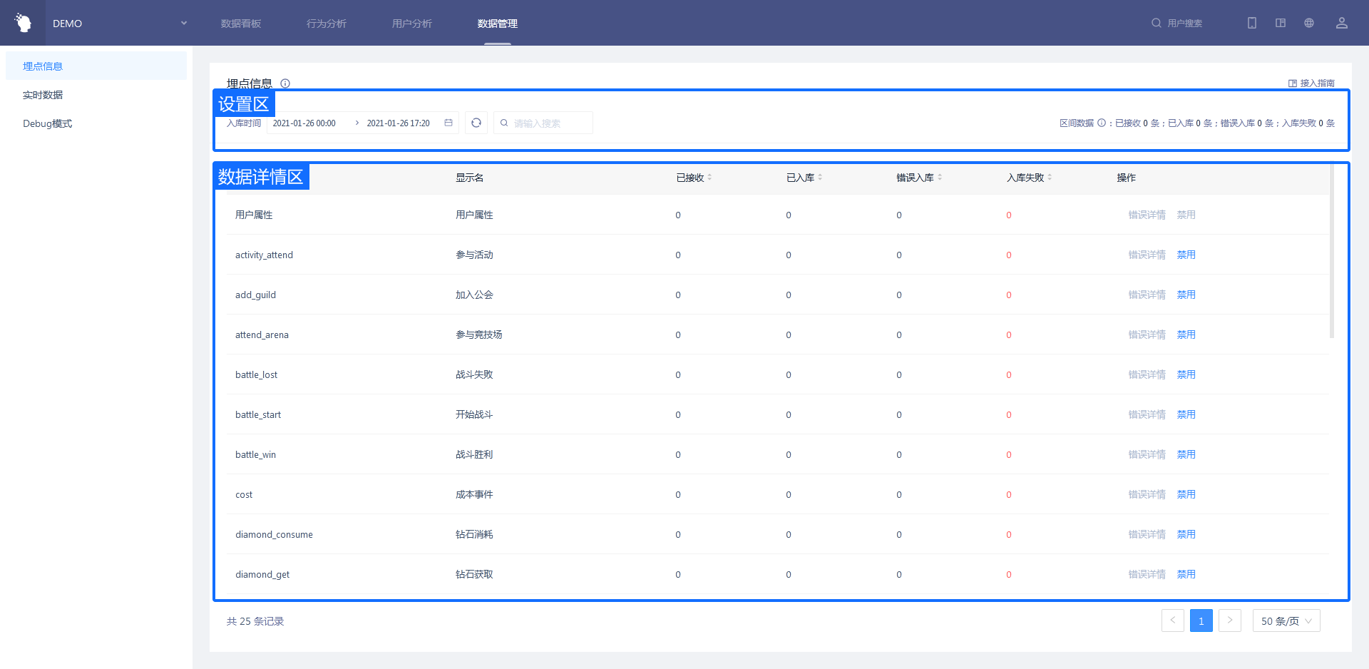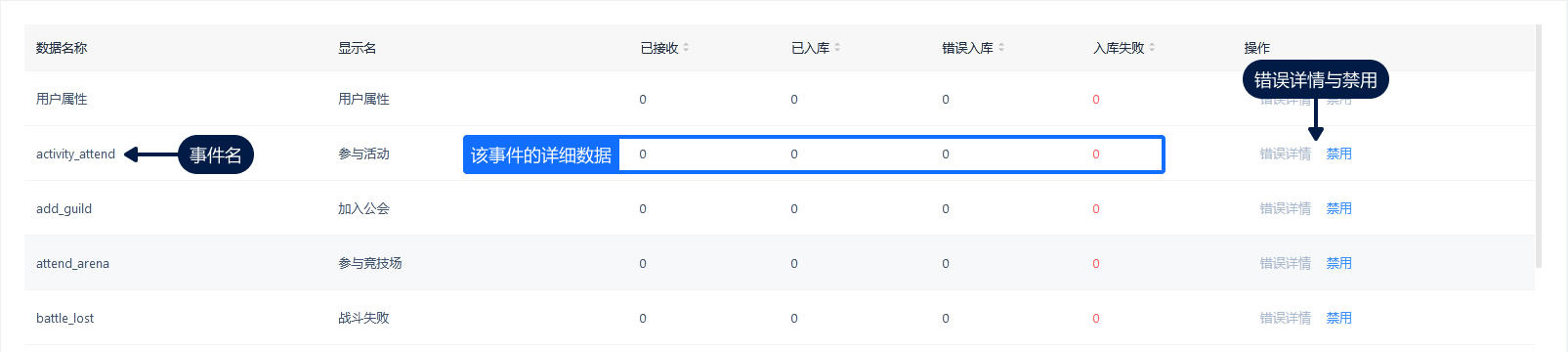 数据详情区域展示各事件(用户属性)下的已接收、已入库、错误入库和入库失败数据,并支持对事件进行禁用/启用设置或查看事件的错误详情等操作。