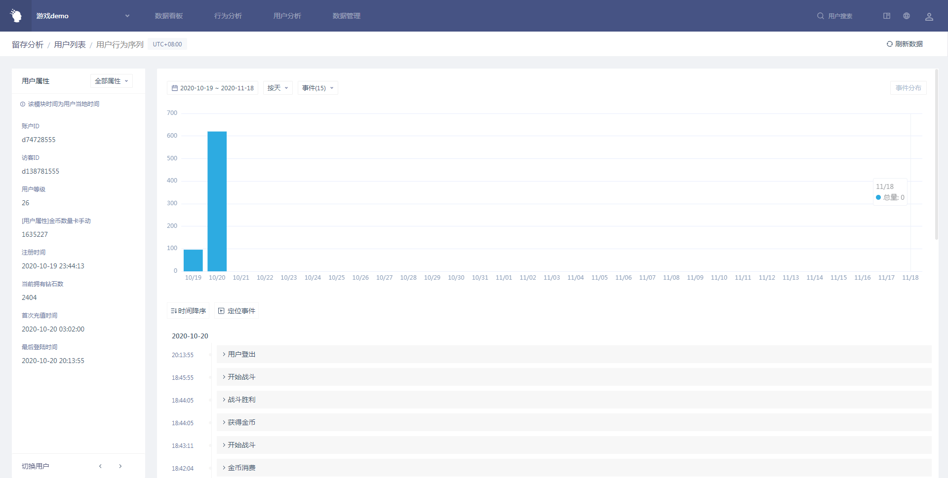 包含用户属性区、行为统计区、行为序列详情区、用户切换区