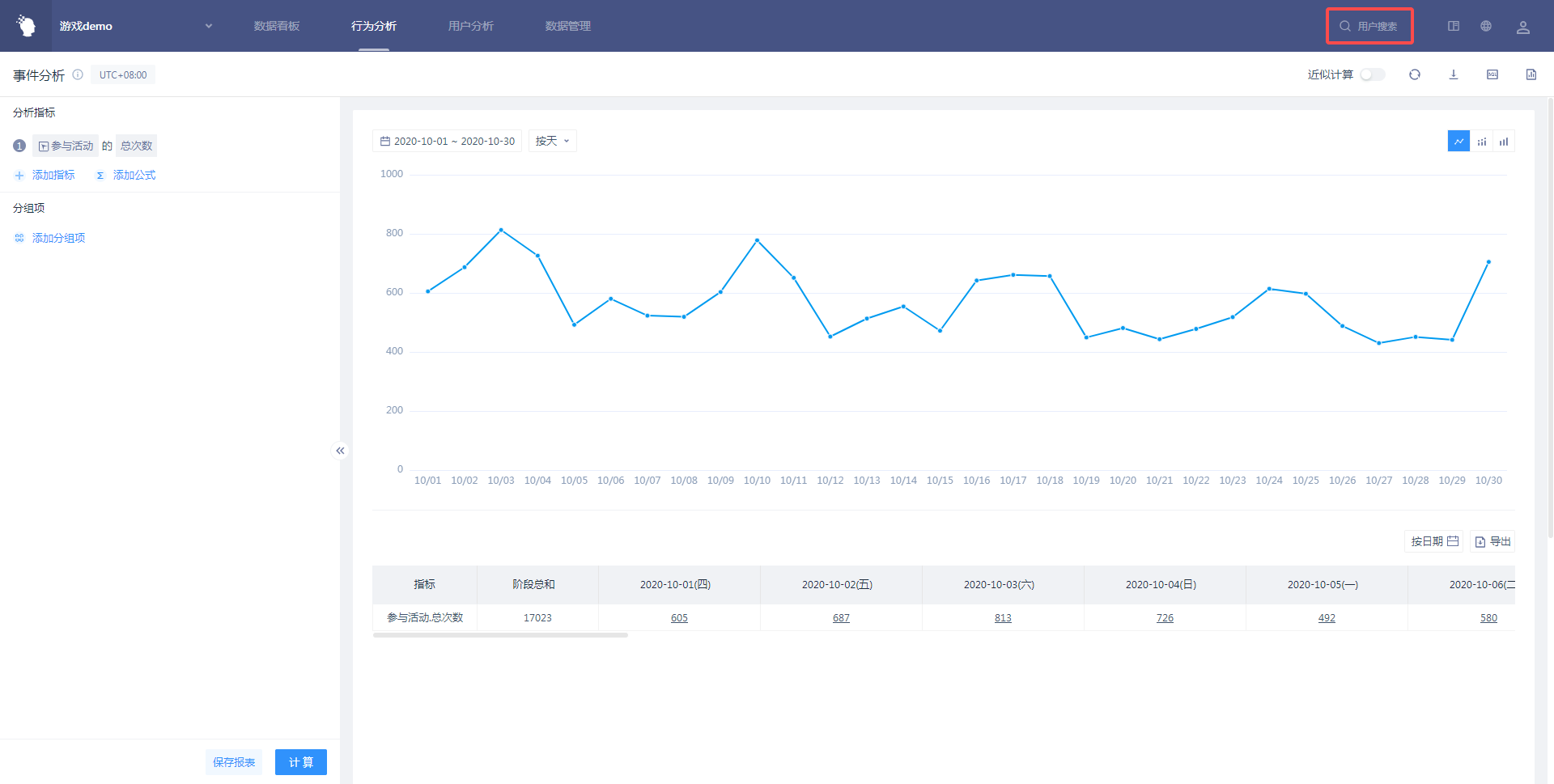 用户搜索最常规的用法,是通过 ID(包括用户的设备 ID、账号 ID、手机号等)查找用户,再进入用户行为序列中定位明细数据。通过上述操作,可以在数据异常定位、订单数据确认、测试数据校验时使用。