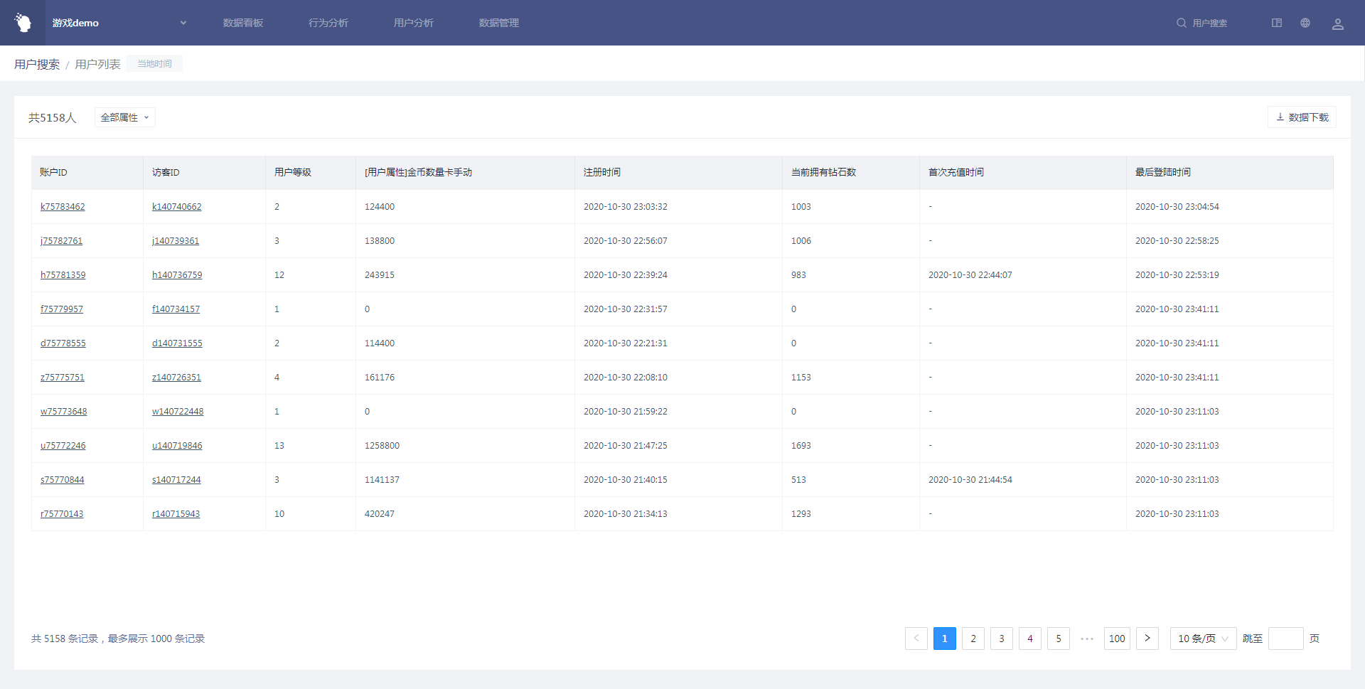 属性筛选、用户列表表格部分与用户列表中相同,均可进行关注属性的筛选 下载数据时,可下载完整用户数据,最高下载上限为 100 万条