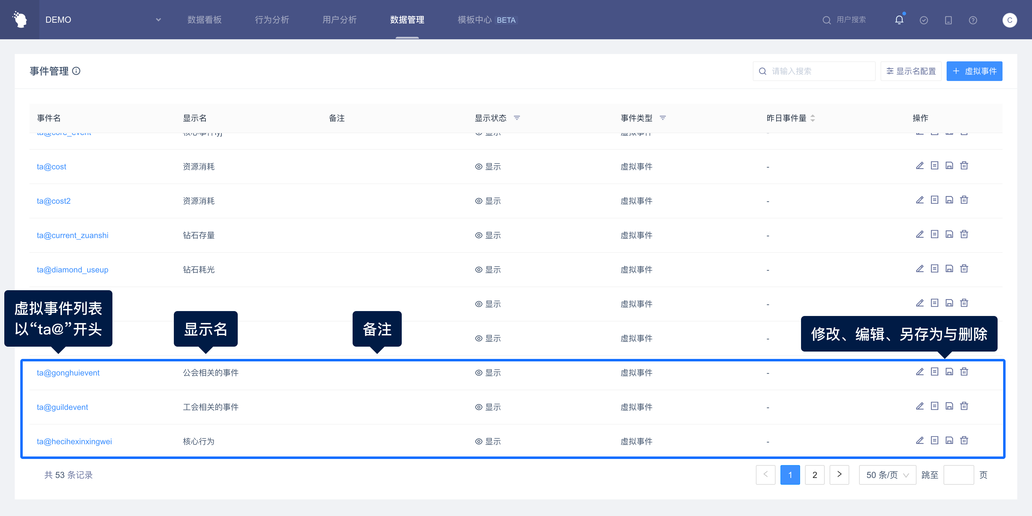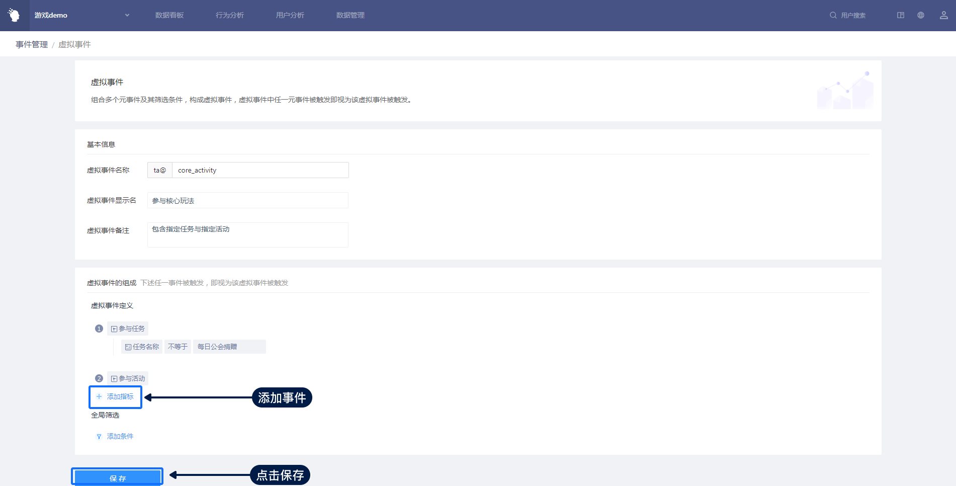 可以将多个意义相近的事件组成虚拟事件,比如将产品中主要行为的元事件组成的虚拟事件“核心行为”,可将其应用于留存、漏斗等分析模型中。