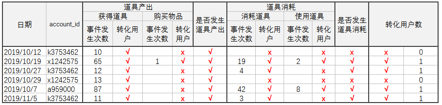 如: 上述表格中,当天发生“道具产出”下的“获得道具”、“购买物品”,同时发生“道具消耗”下的“消耗道具”、“使用道具”。