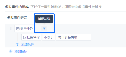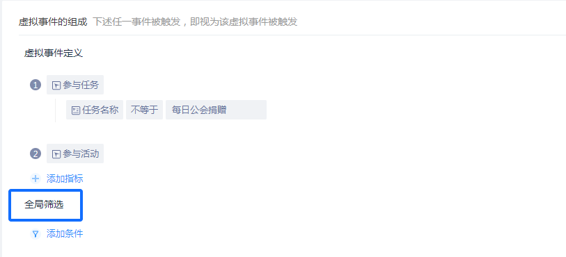 当虚拟事件中有两个及以上元事件时,出现“全事件符合”选项。创建“全事件符合”筛选项时,全部元事件均在满足该筛选项的条件下发生。